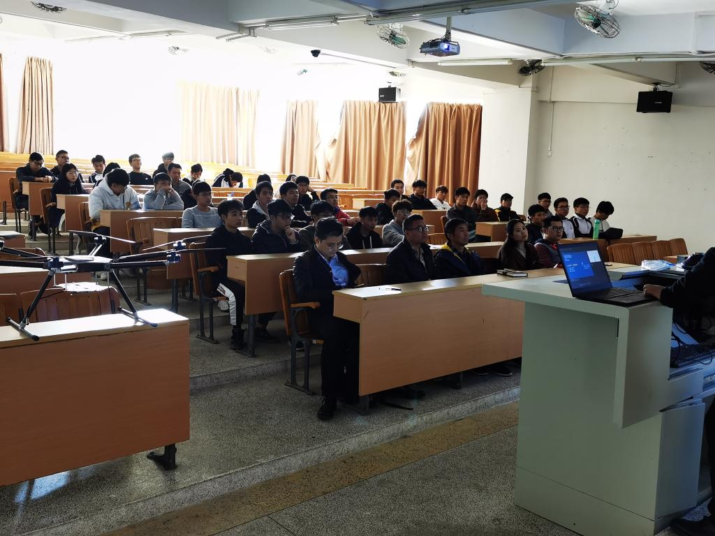 讲座上,王经理以航测从愿景到规模化应用为主题,从无人机低空遥感发展、典型航测无人机和任务荷载、航测数据处理、航测与传统测绘对比和航测数据应用等五个方面深入浅出地讲解了无人机航测技术应用,他还展示了南方测绘自主研发的全新高性能碳纤多轴飞行平台—ZR-M66无人机,为师生讲解ZR-M66无人机的飞行原理和应用。