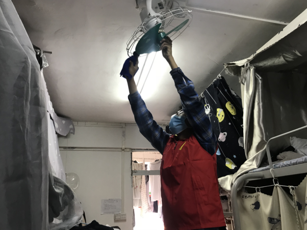 志愿者们带着满腔的热为女生宿舍进行清洗风扇志愿服务。在活动过程中志愿者们积极耐心,分工协作,不怕脏、不怕累,小心翼翼地拆下每个风扇,对风扇进行擦洗,细腻而认真,丝毫不粗鲁。接近3个小时的时间,近50间宿舍布满灰尘的电风扇焕然一新。