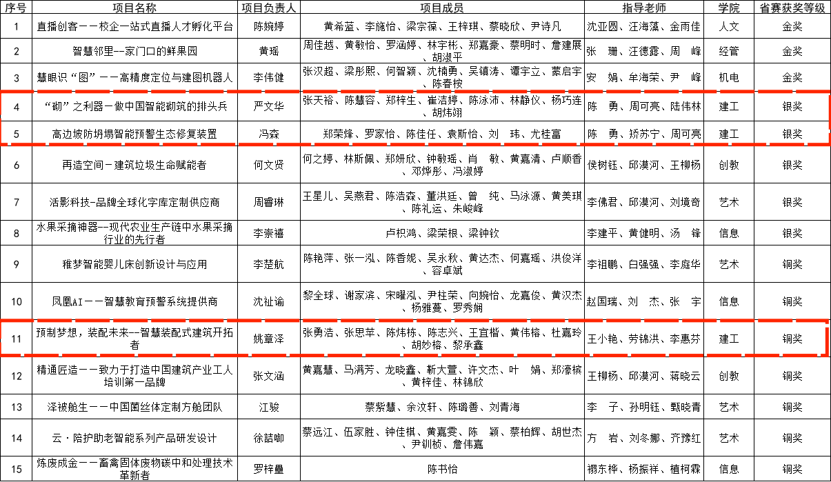 经过激烈角逐,我院入围省决赛项目“砌”之利器——做中国智能砌筑的排头兵(学生团队:严文华、张天裕、陈慧容等;指导老师:陈勇等)与高边坡防坍塌智能预警生态修复装置(学生团队:冯森,郑荣峰,罗家怡等;指导老师:陈勇等)两个项目在广州城建职业学院1058个参赛项目中脱颖而出,获得省赛银奖。
