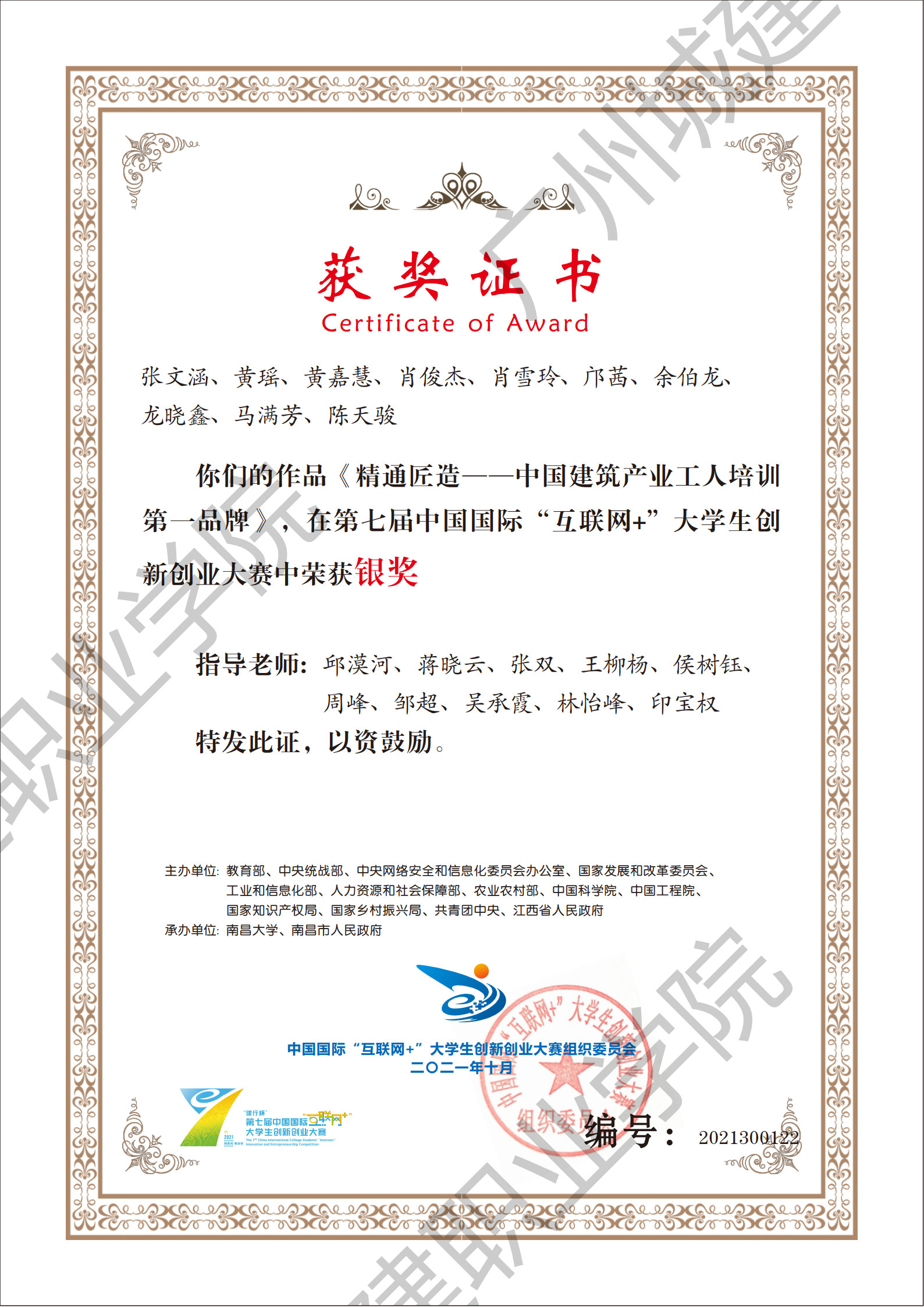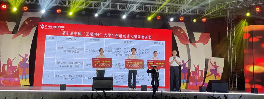 2021年10月12—15日,第七届中国国际“互联网+”大学生创新创业大赛总决赛在江西省南昌大学举行,经过激烈角逐,我院学子张文涵团队荣获全国总决赛银奖的成绩,广州城建职业学院校长蒋新华在先进个人颁奖典礼上为其颁奖。