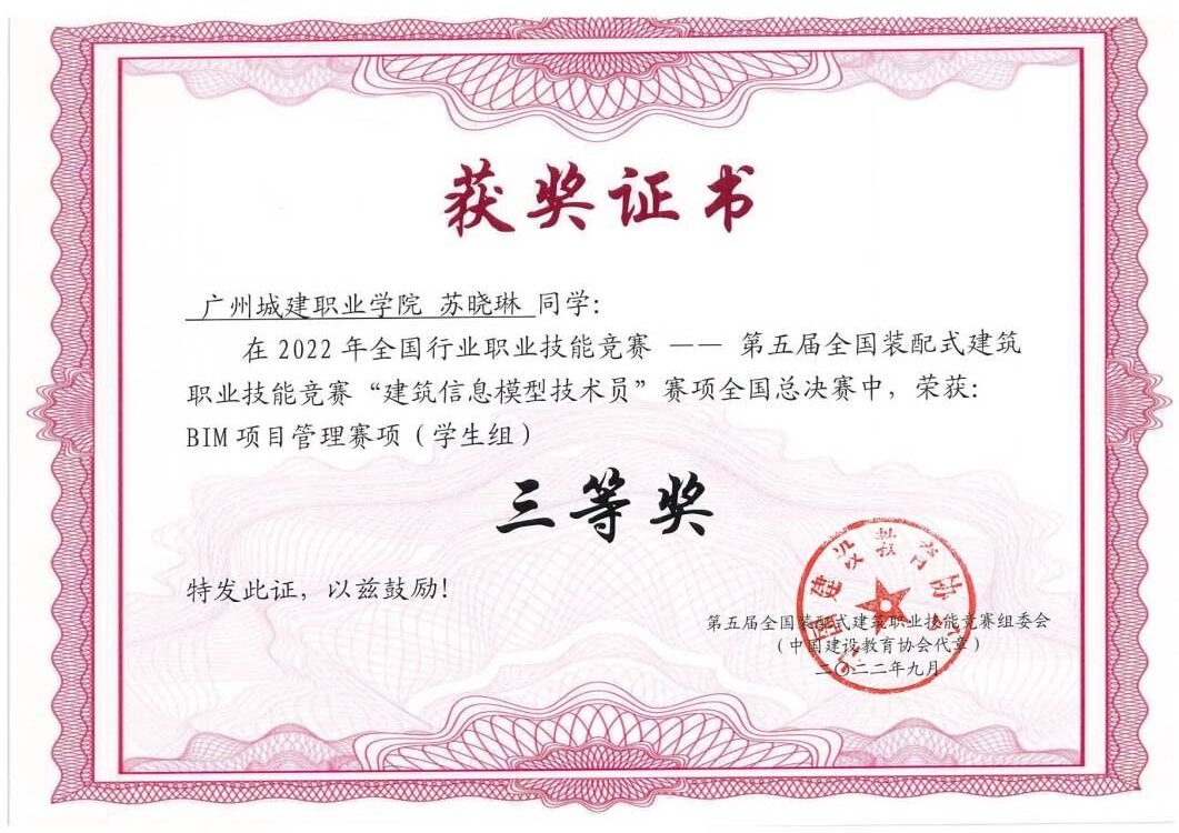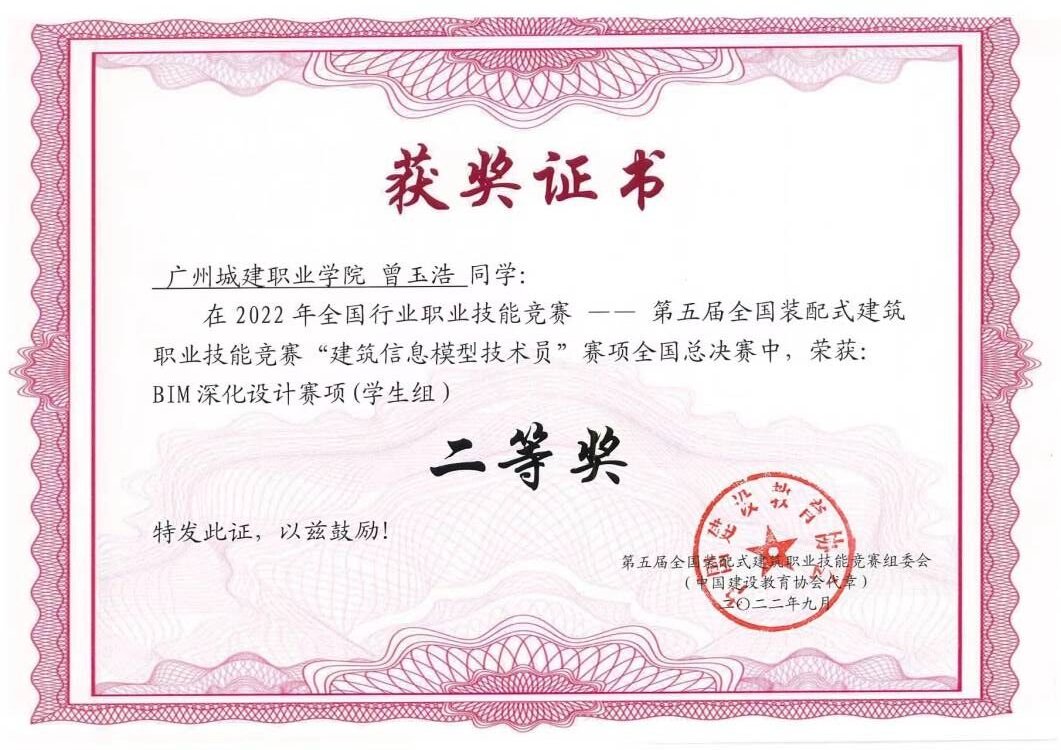 学生组于9月24日通过线上方式完成,我校best365网页版登录21级工程造价BIM1班曾玉浩和20级工程造价9班苏晓琳同学,分别在“BIM深化设计”、“BIM项目管理”赛项中获得全国二等奖、三等奖。