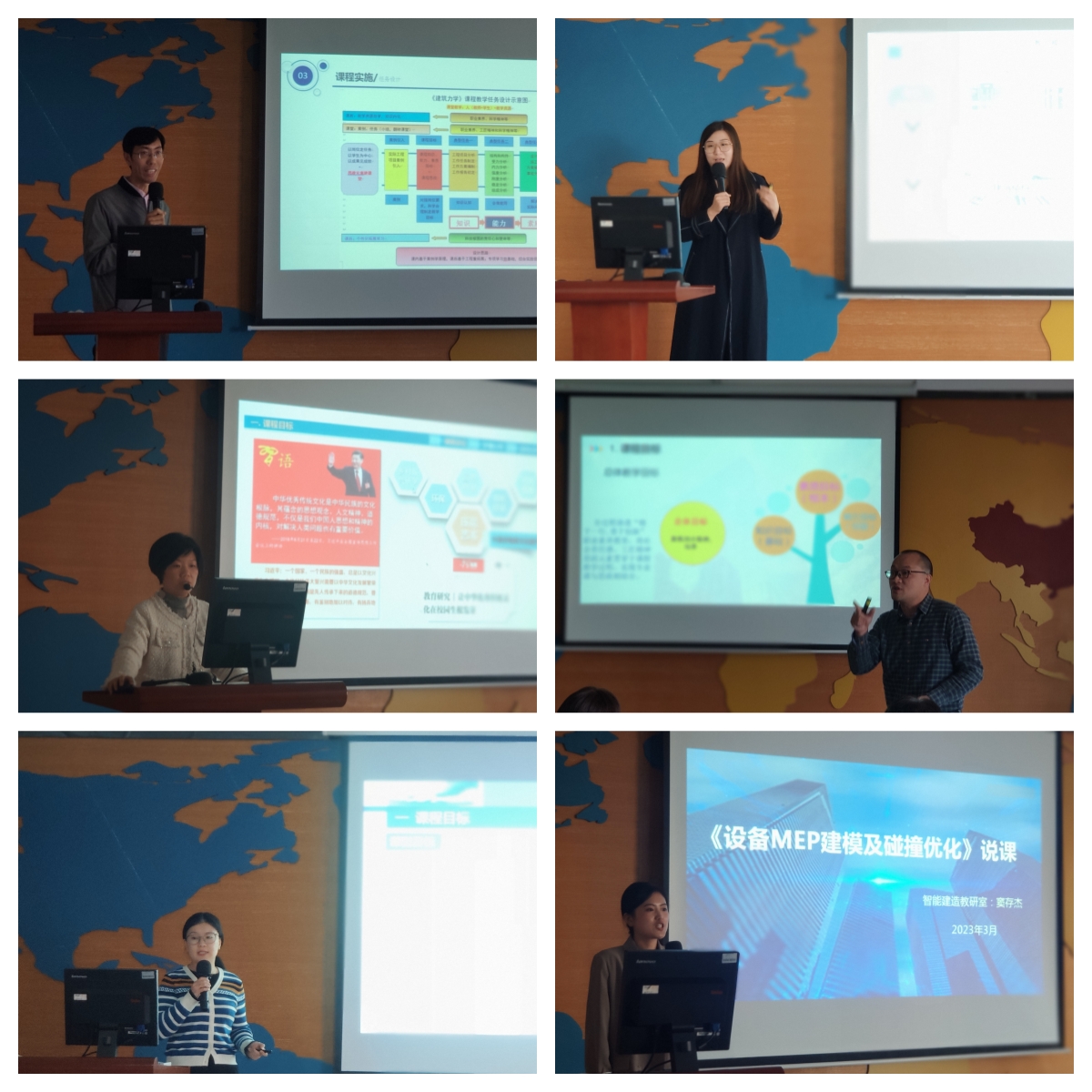 有9位新教师、10位老教师作为“说课”教师参与本次活动,并邀请了5位教学名师担任评委工作。参与说课的教师赛前做了充分的准备,从课程目标、课程内容、课程实施、课程资源、课程考核评价、特色创新与成效等六个方面对自己的任教课程展开介绍。