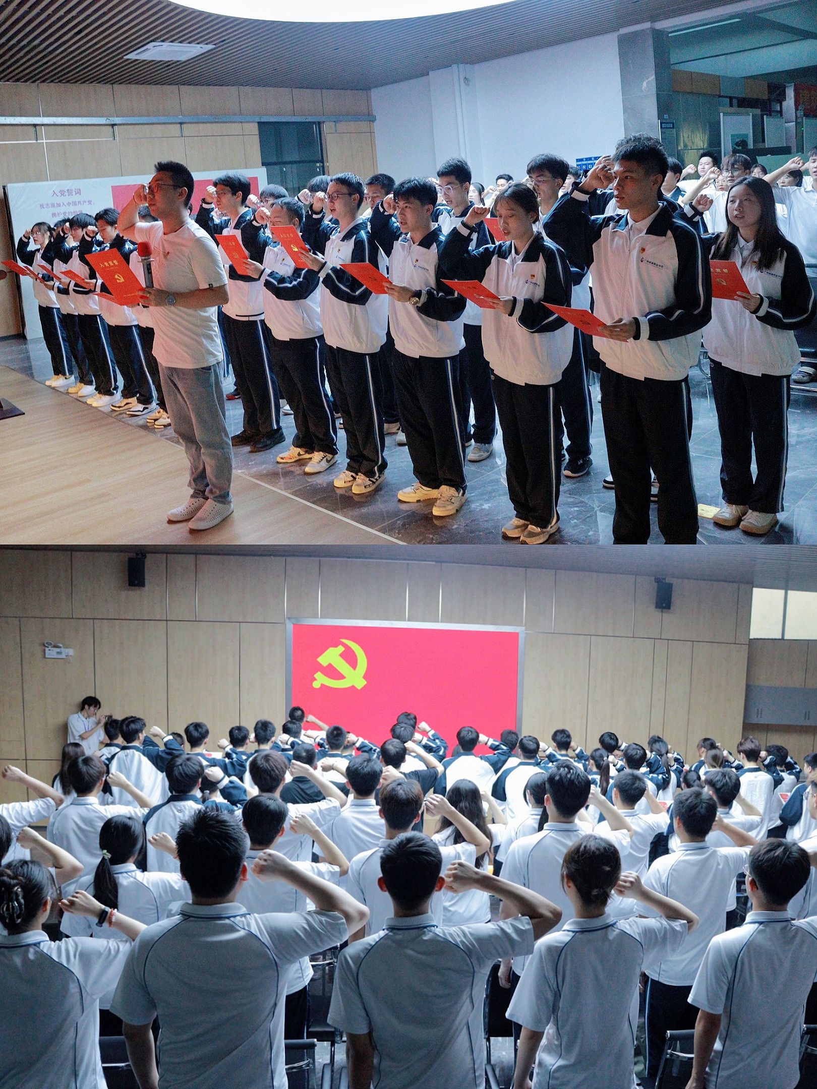 集中宣誓仪式在国际歌中拉开序幕。首先,21级中共预备党员苏伟坤、唐瑞斌作为代表分别发言,他们均对新血液的注入表示了欢迎,强调新发展党员需要不忘初心、牢记使命,用自己的实际行动去践行党的宗旨,为党的事业奉献出自我力量,无愧于党组织地培养。随后,4名教师为29名新发展党员佩戴党员徽章并在邹超老师的带领下,面对鲜红的党旗,高举右拳,用激昂的声音庄严宣誓,现场庄严肃穆,振奋人心。新发展党员代表钟佳欣、杨庆峰、伍宇斌也分别上台在党旗下表态,他们在发言中表示,一声誓言,一份承诺,一生坚守,要牢记党员身份,恪守党员标准,永葆党员本色,用毕生的追求与行动,践行今天的庄重宣誓,他们郑重向党组织承诺,请党组织在实践中考验自我。最后,宣誓仪式在剪党徽和宣誓墙打卡中结束。