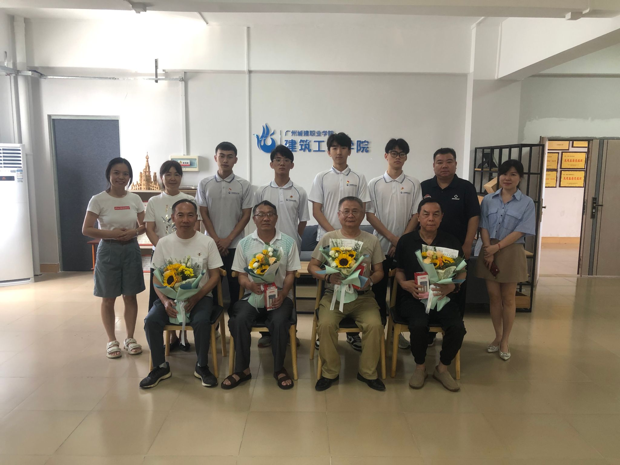 最后,学院领导和学生代表一起为四位老师送上美丽的鲜花和纪念品并合影留念,一支粉笔,两袖清风,愿我们为教育事业辛苦奉献了一生的老师们老有所乐,幸福安康!