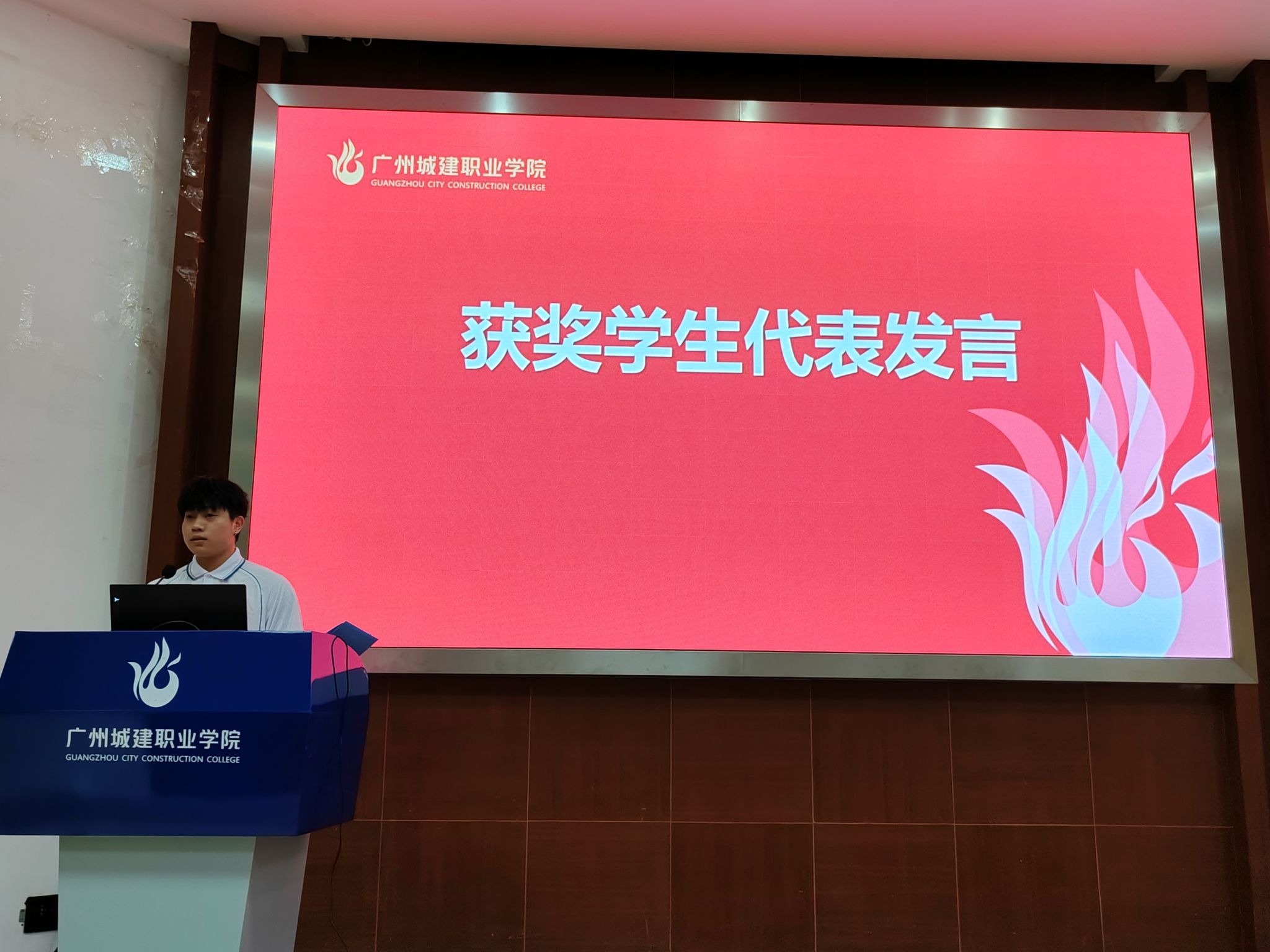 获奖学生代表陈铭津上台发言。他提出要敢于尝试,要有不怕苦,不怕累的精神,努力拼博,只有踏出第一步才能够有所获,有所得。同时他鼓励师弟师妹只有不断的提升专业技能,提升自我学历,才能更好的发展。