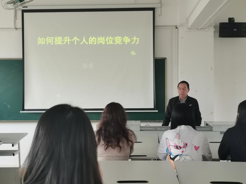 讲座中,陈勇老师主要围绕“如何提升个人的岗位竞争力”这一内容进行讲解,他用生动有趣的语言,切实有效的案例,带动毕业生们积极参与交流与思考,现场氛围活跃。陈勇老师强调端正就业心态的重要性,切忌骄傲自满或过度自卑,要正确科学的评价自我,学会为人处世,重视专业知识与实践活动相结合,要不断反思自我,总结经验,吸取教训,提升自身的职业竞争力。