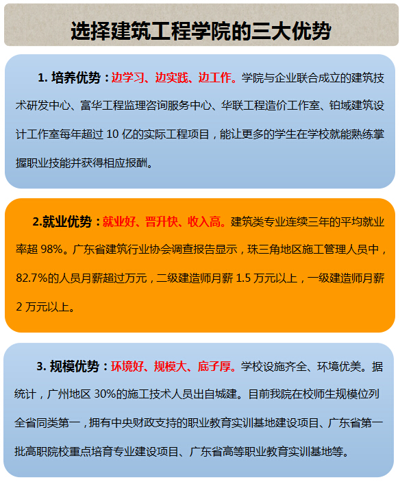 近年本专业就业形势持续走高,待遇可观,职业发展空间巨大。据《2013年中国大学生就业报告》显示,本专业社会需求量在毕业生所能从事的321个行业中排第一位。广东省建筑行业协会调查报告显示,珠三角地区熟练施工管理人员中,82.7%的人员月薪超过万元,二级建造师月薪1.5万元以上。 |