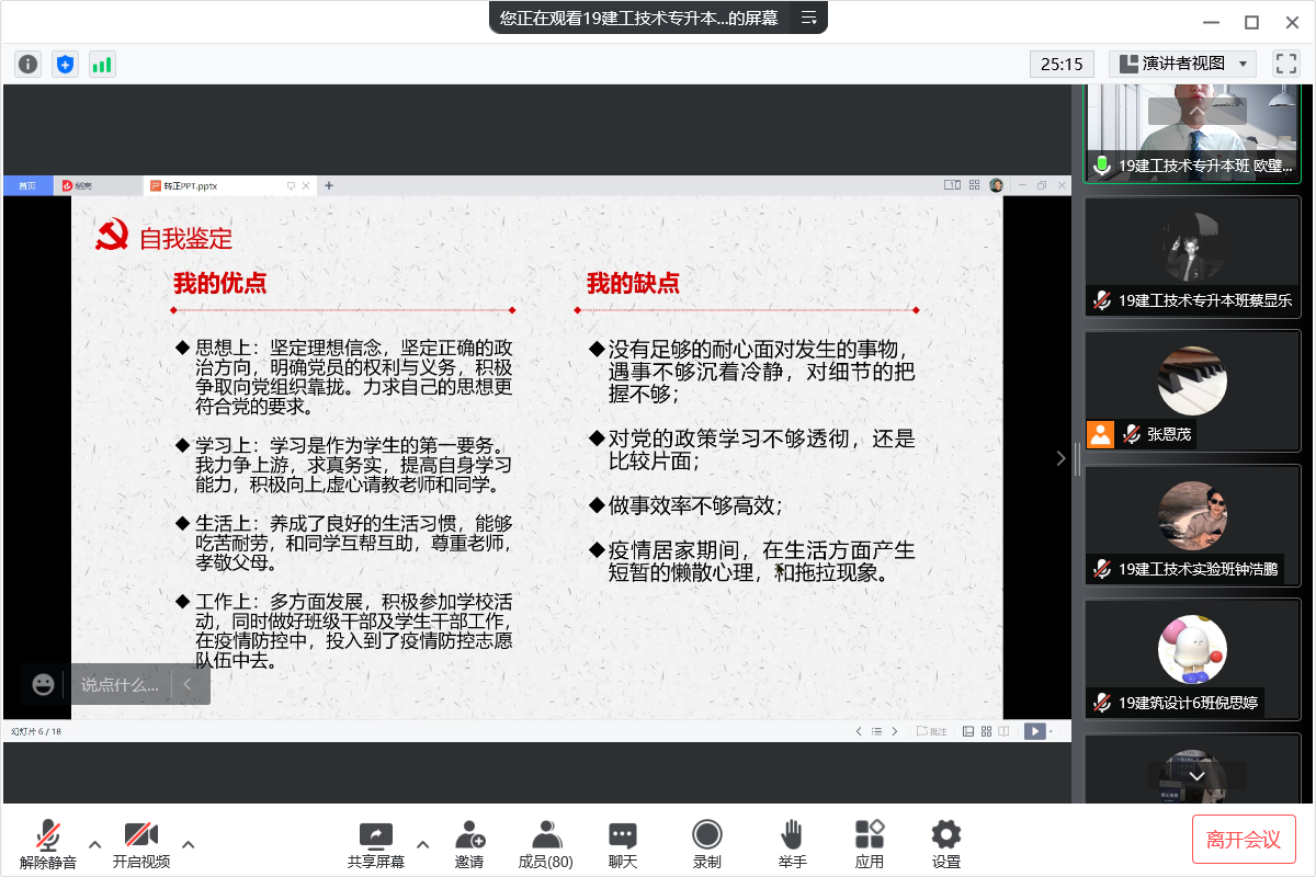 其次,支部预备党员针对个人预备期情况进行分享。49名预备党员结合个人实际情况从个人思想、学习情况、生活作风以及工作情况等多方面进行分享,均能做到从实际出发,实事求是。同时,各党员根据自身实习期间发挥党员先锋模范带头作用的情况开展批评与自我批评。