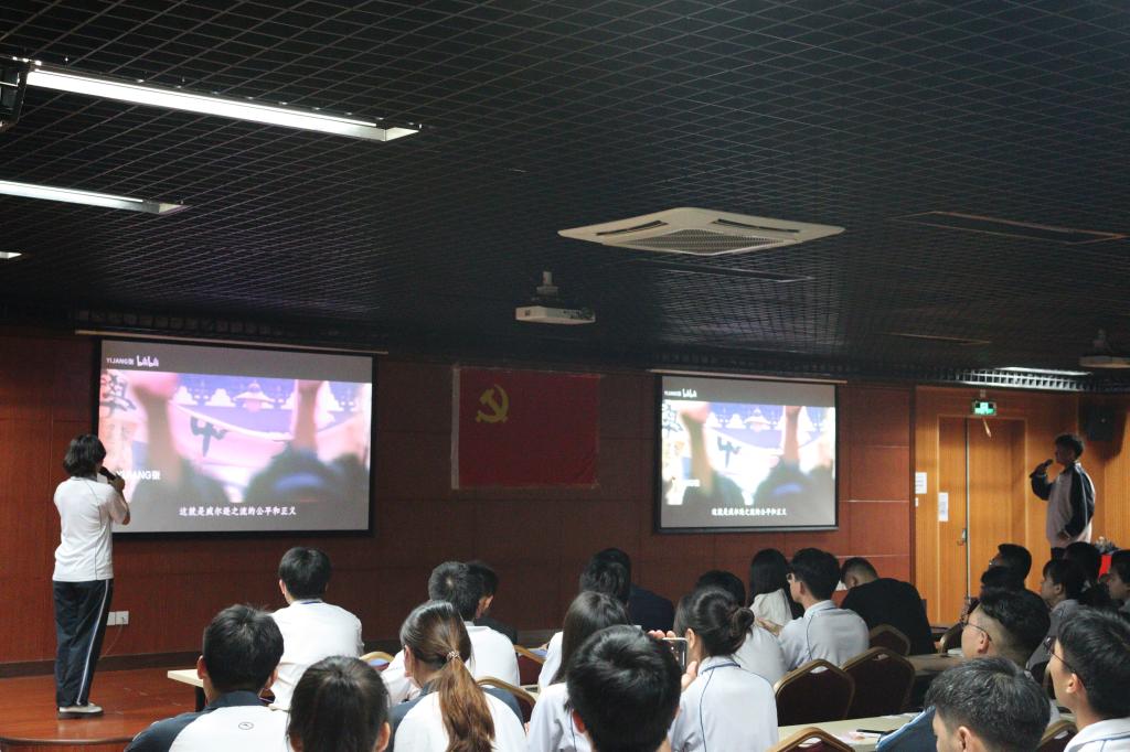 活动在国际歌中拉开序幕。首先进行了红色配音大赛决赛,参赛成员对《觉醒年代》《我和我的祖国》《长津湖》等经典红色影视作品片段进行了配音演绎,将配音内容表现得青春激荡,热血沸腾,带领在场人员回忆与感受建党百年来的重要革命及革命精神,用青年之声对革命时代的红色精神作出新的诠释,充分展现了同学们的良好精神风貌,彰显了同学们的爱国情怀。