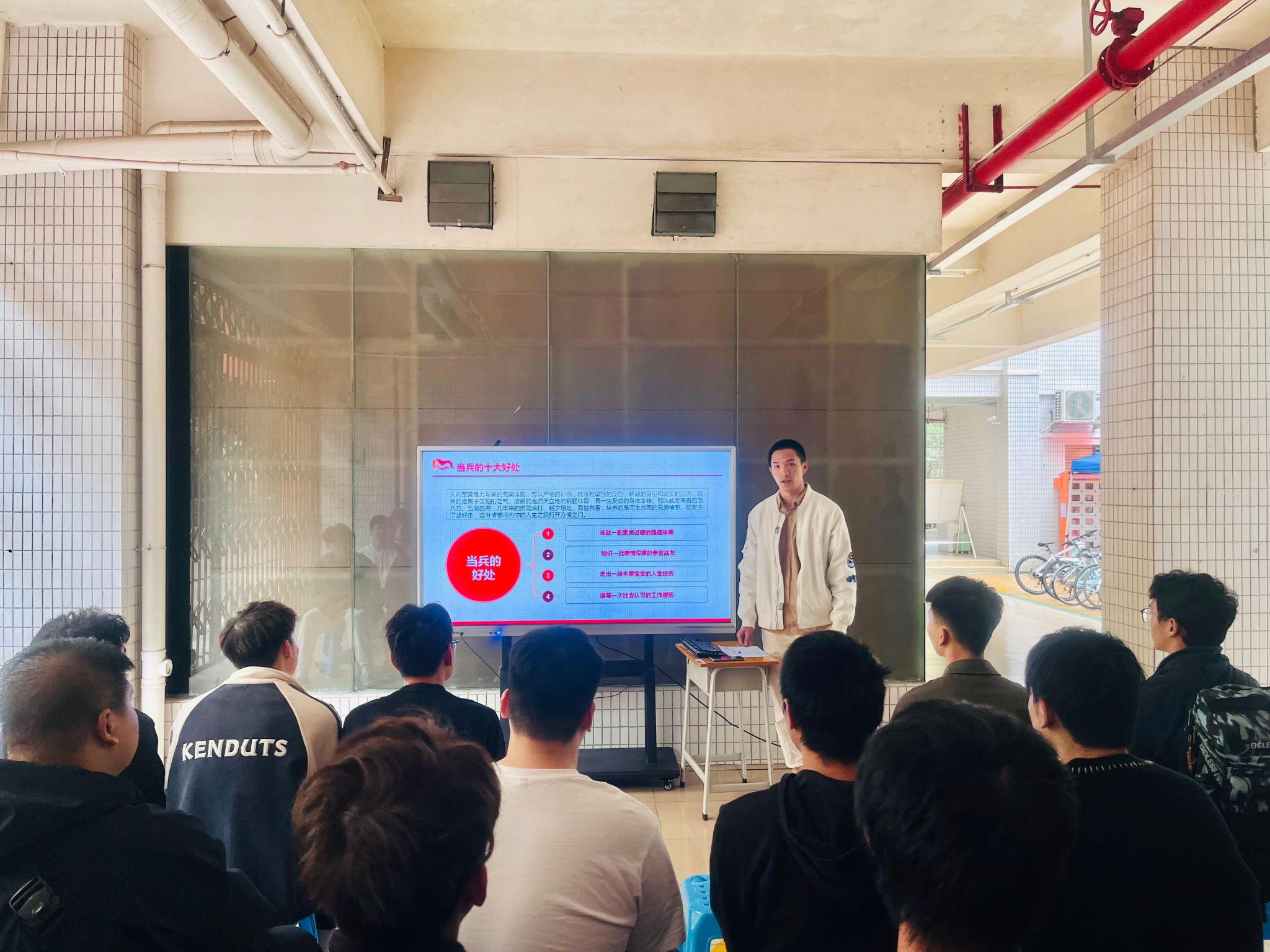 随后,胡国兴老师从征兵工作流程、征兵体检的标准及大学生征兵的最新政策进行讲解,希望在座同学向两位退伍学生学习,用实际行动积极投身到国防事业中去,充分展现新一代青年的奋斗英姿。