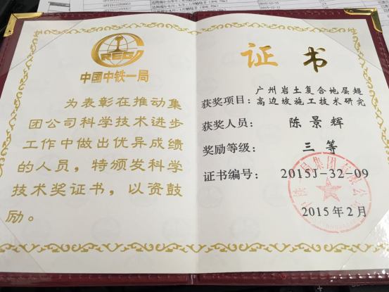 在今年3月份项目表彰中,我的辛勤工作,一致获得领导及项目上认可,获得项目先进个人。同时今年2月份,我负责的高边坡在施工技术研究上获得中国中铁一局科学技术表彰获得三等奖。